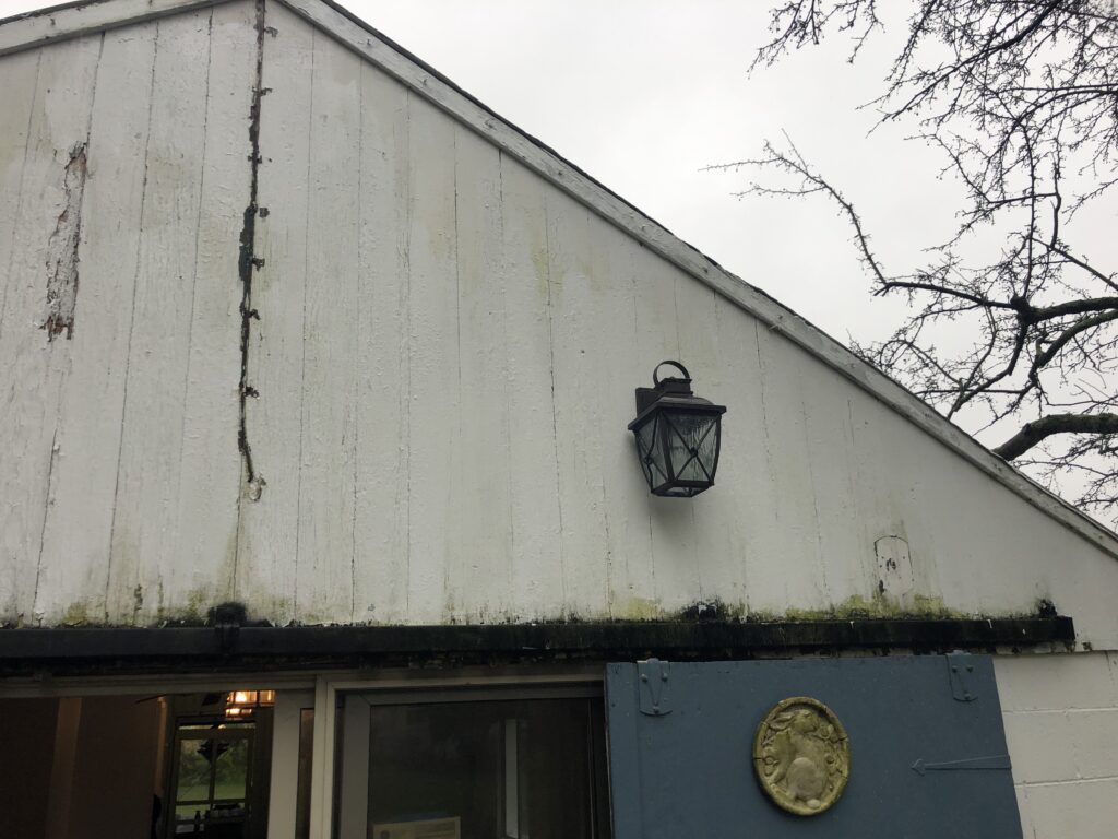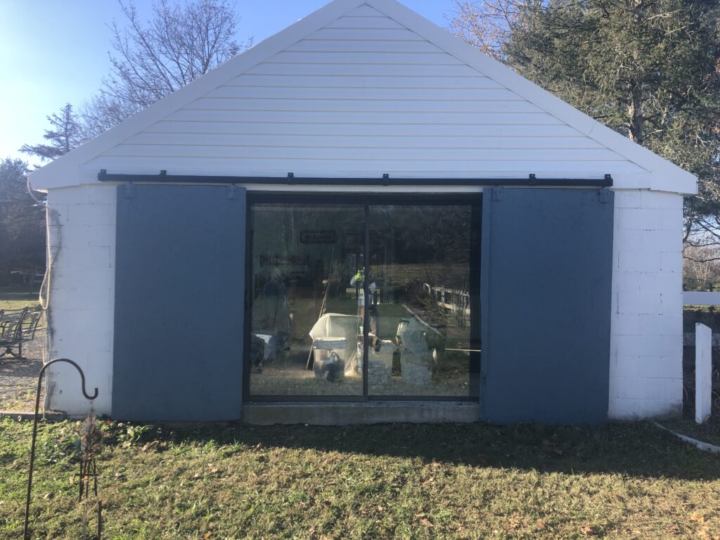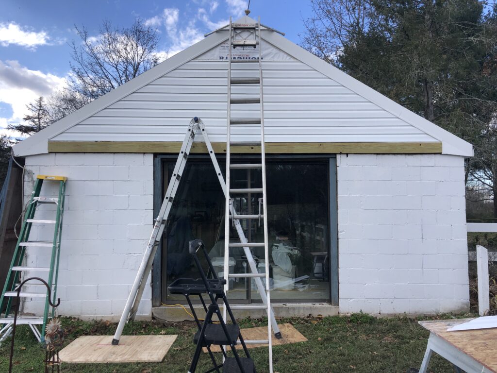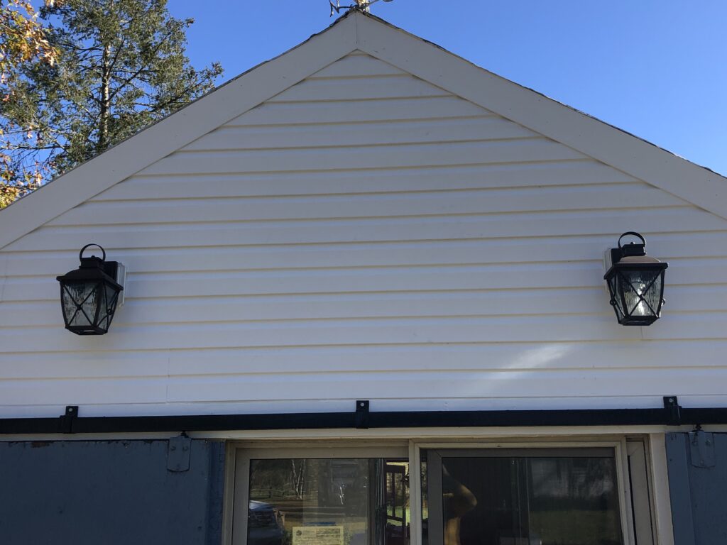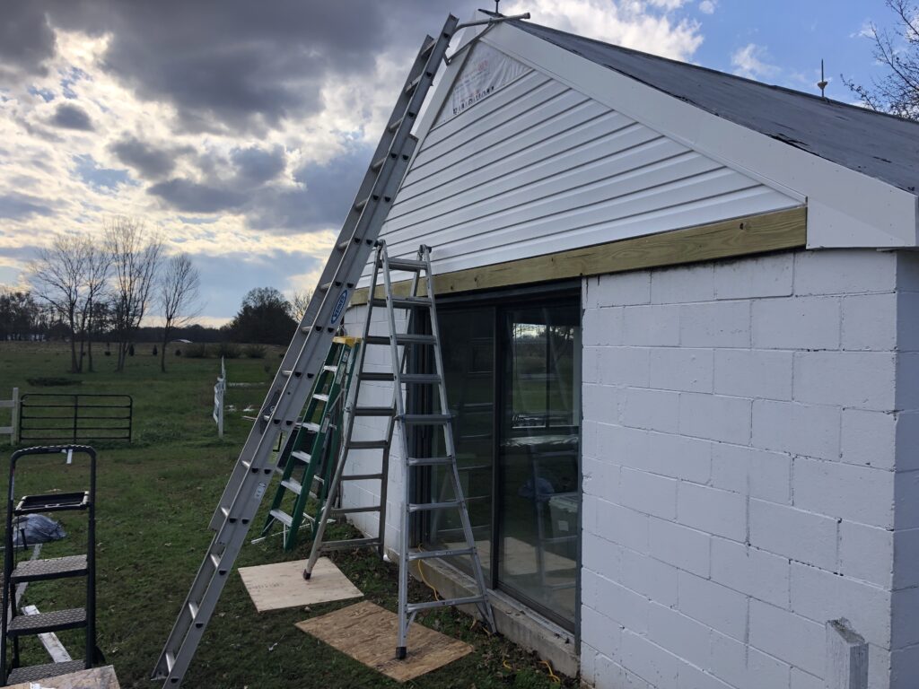 Mission: to clean up the appexes of the Stable House, taking off the old trim, repairing the current siding, putting up new trim and tyvek and siding. Also, repainted the barn door hardware and re-hung the doors.