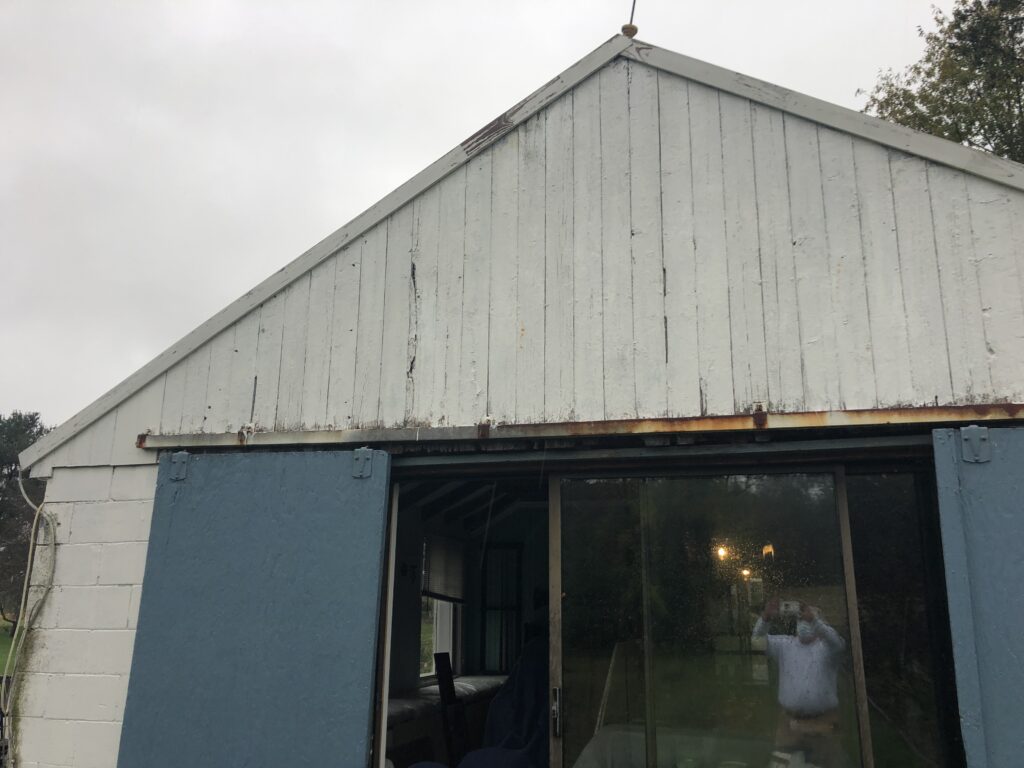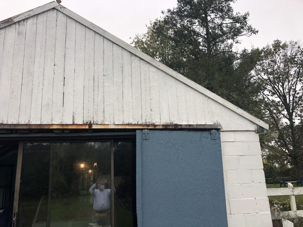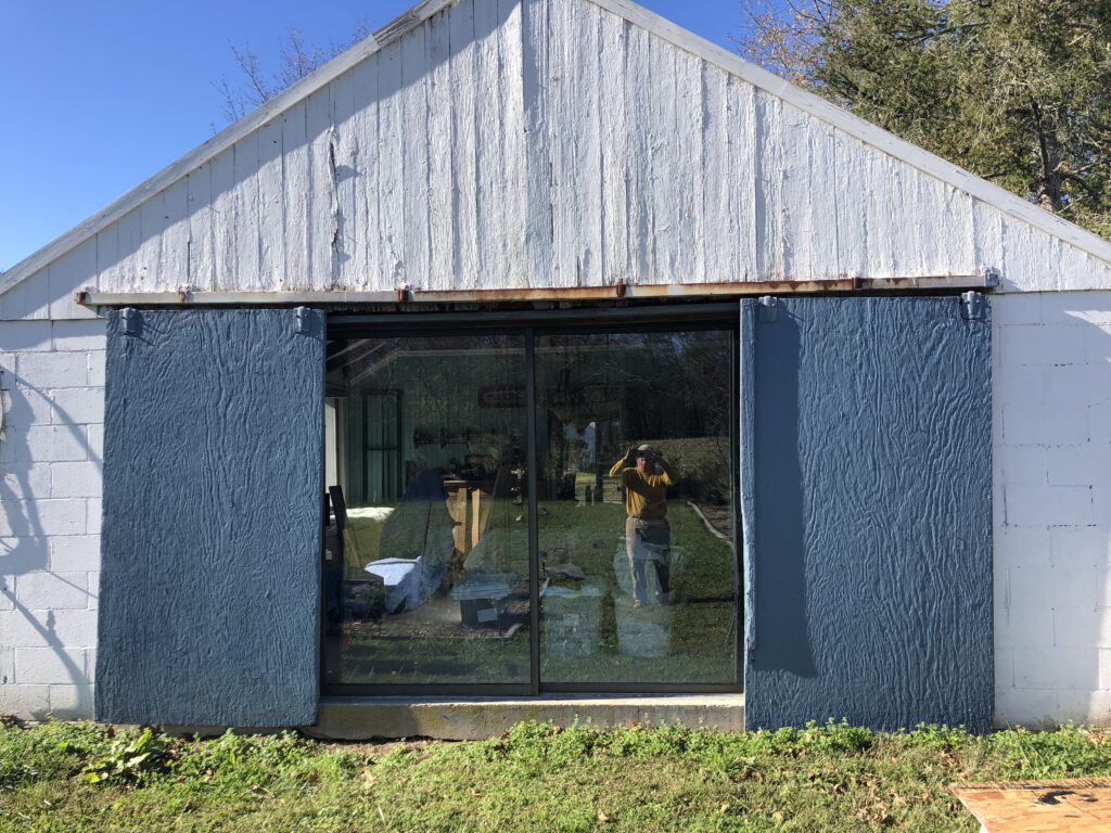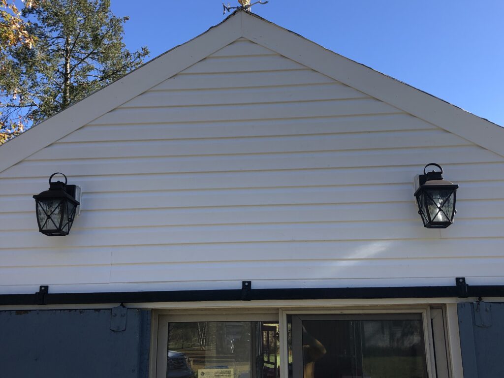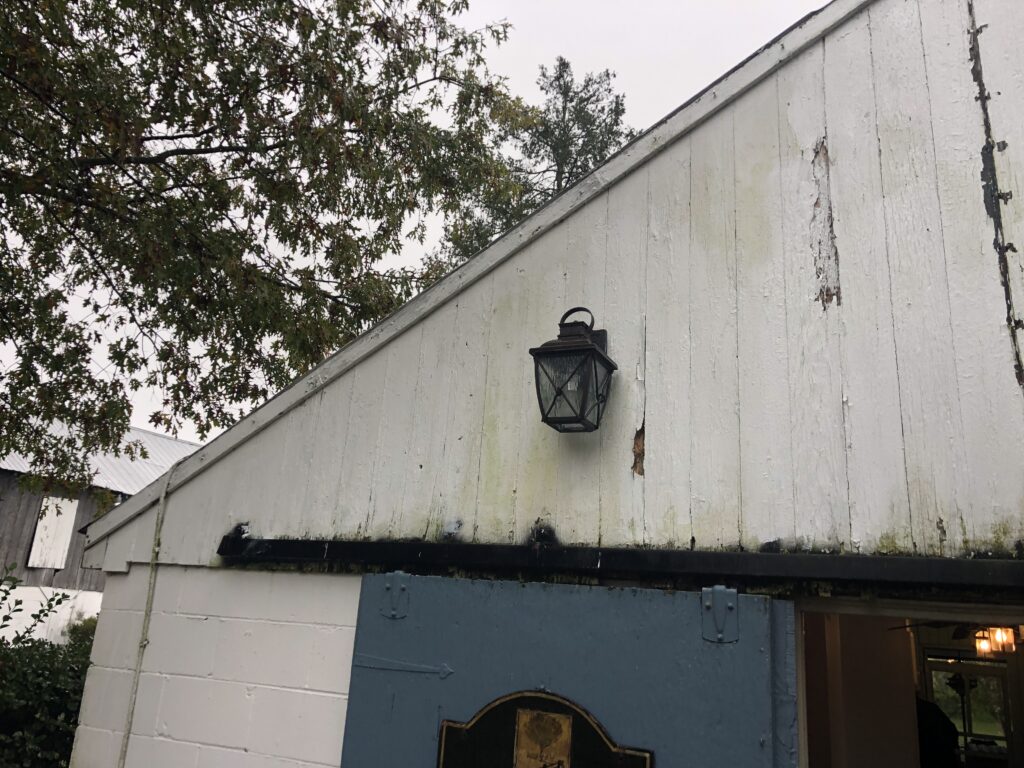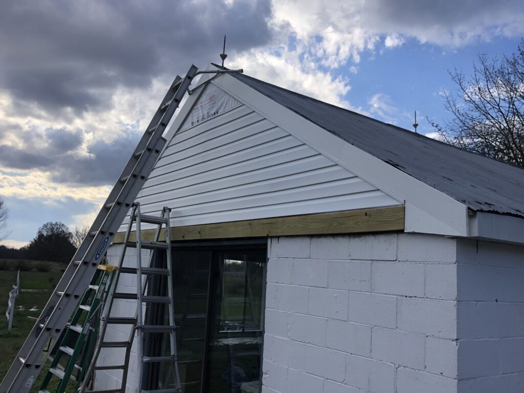 Mission: to clean up the appexes of the Stable House, taking off the old trim, repairing the current siding, putting up new trim and tyvek and siding. Also, repainted the barn door hardware and re-hung the doors.